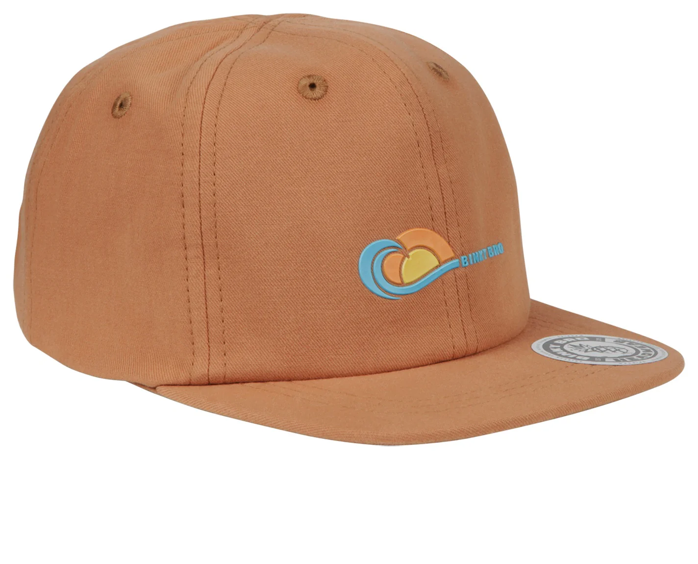 The Brooks hat has a new "Binky Bro Wave/Sun" logo on the front. All panels are made from a textured cotton fabric. The back snap is a matching camel color.