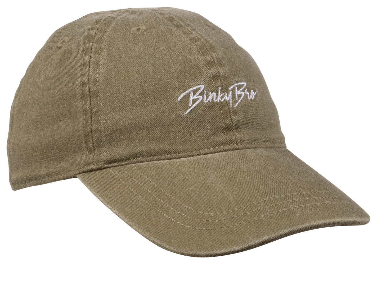 The Cumberland Army hat has an embroidered "BinkyBro" cursive logo on the front. All panels and the bill are made from a cotton Army colored washed fabric. The back snap is a matching Army washed color. This hat is shaped like a traditional "Dad" hat with a pre-curved brim.