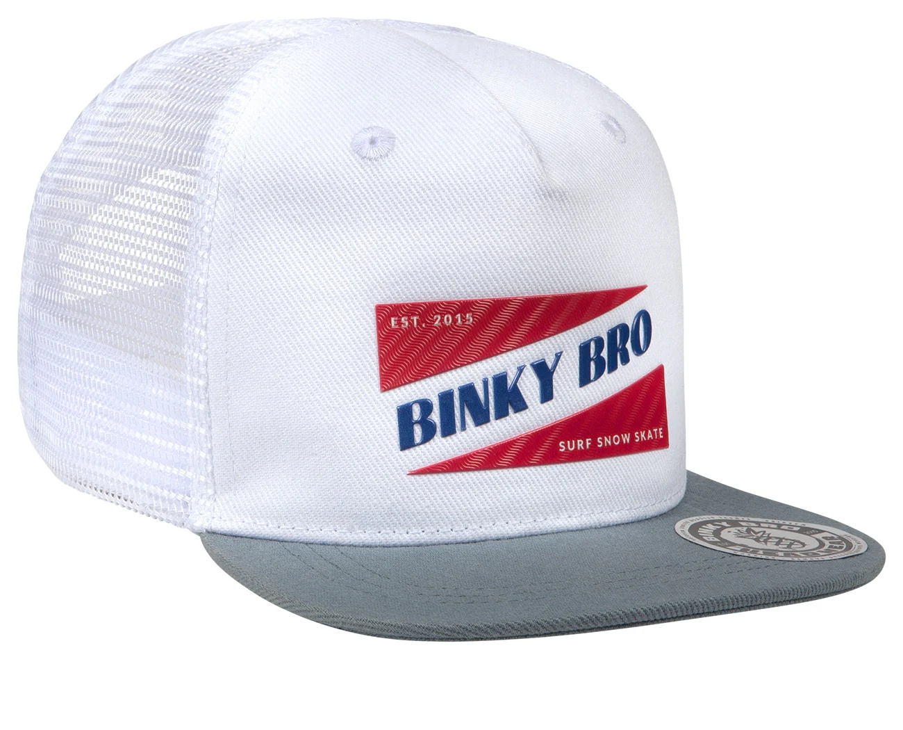 The G-Land hat has a vintage "Binky Bro" logo on the front. The front panels are a white fabric. The two back panels are a white mesh. The bill is a light blue/grey color. The back snap is a matching white color.