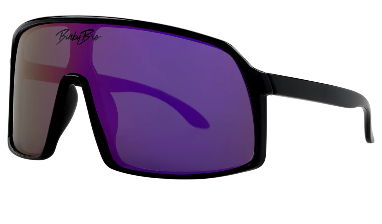 Our Monteverde Purple sunglasses have black rims with a purple reflective colored lens. Our BinkyBro signature logo is present on the top-middle of the lens. Size fits best for kids in the 18 months - 5 year range.