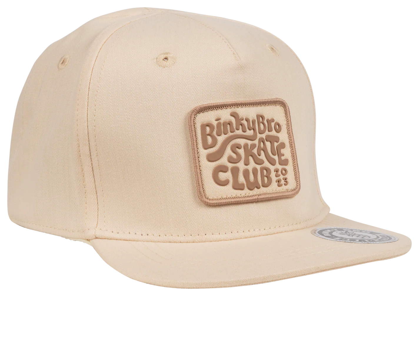 The Oaxaca Snapback has a beige BinkyBro logo on front, beige front paneling, and beige back paneling as well.