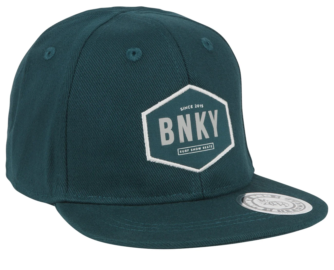 The Pacifica hat has a stitched "BNKY-SURF SNOW SKATE" patch on the front. All panels and the bill are made from a navy teal fabric. The back snap is a matching navy teal color. This hat comes in an infant, toddler, and youth size.