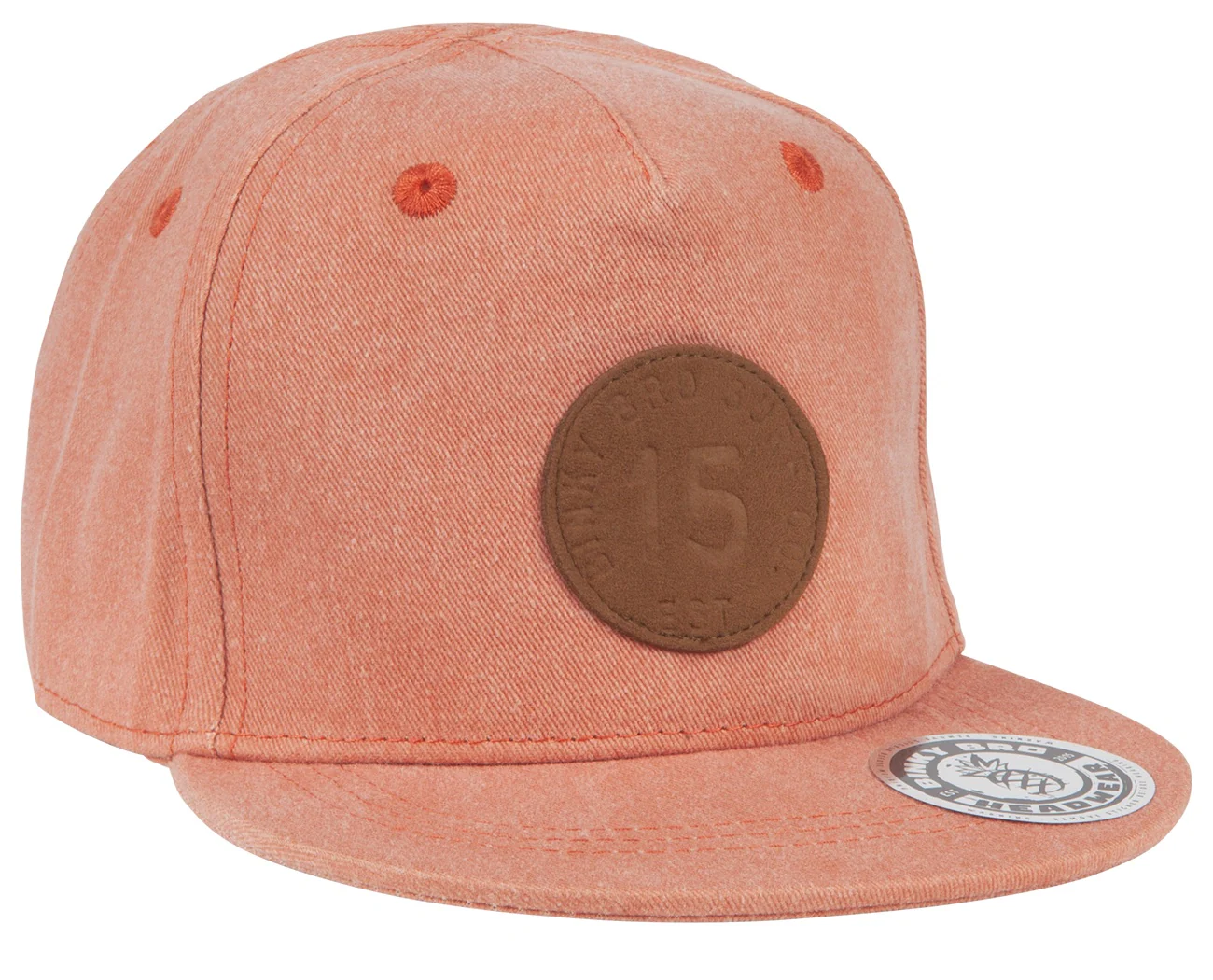 The San Onofre hat has a leather "Binky Bro Surf Co" patch on the front. All panels and the bill are made from a lighter orange washed denim material. The back snap is a matching lighter orange color. This hat comes in an infant, toddler, and youth size.