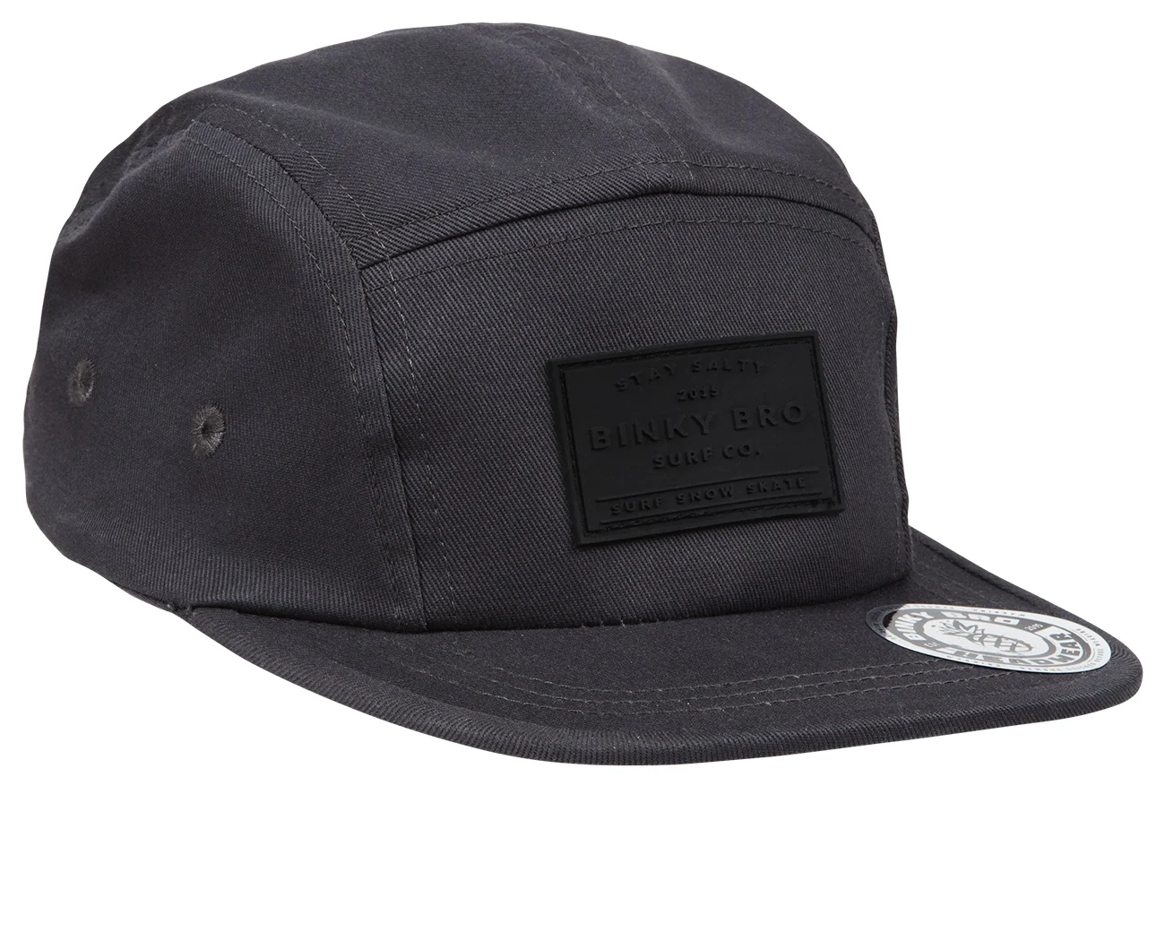 The Uluwatu hat has a black "Binky Bro - Surf Snow Skate" logo on the front. All panels are a deep charcoal color. The snap in the back is also a matching charcoal.
